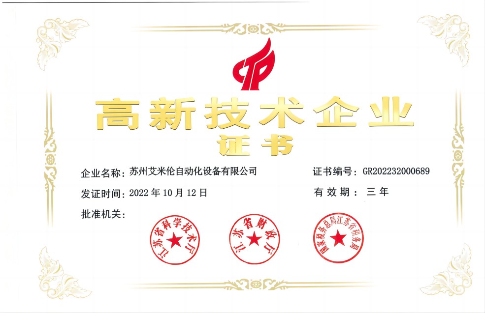 2022年10月12日,苏州艾米伦自动化设备有限公司通过了由科技厅、财政厅和国家税务机关组织的国家高新技术企业认定,并荣获国家“高新技术企业”称号。
